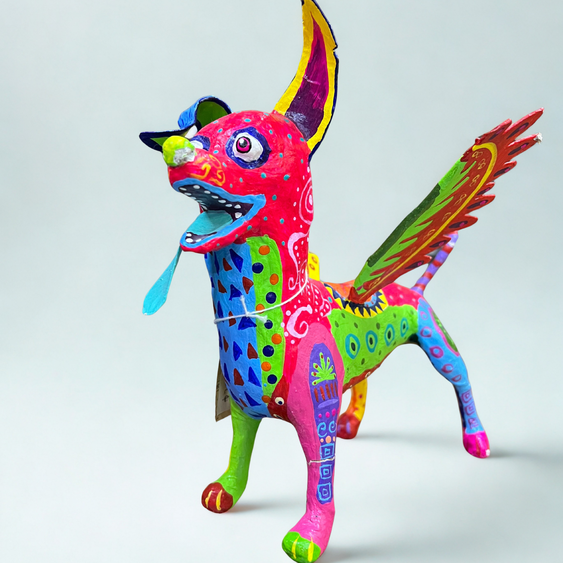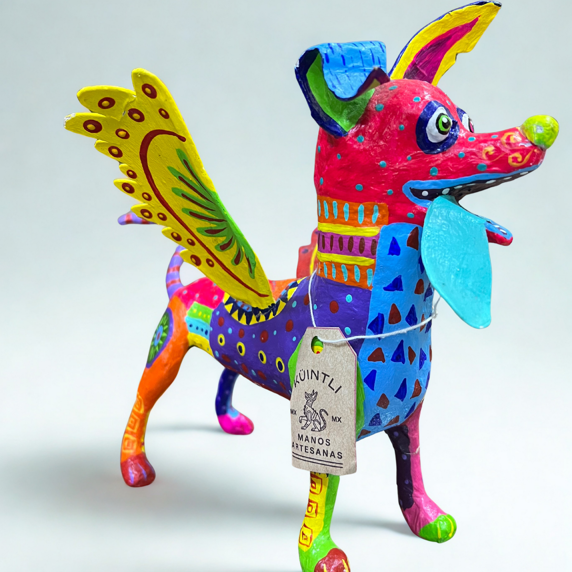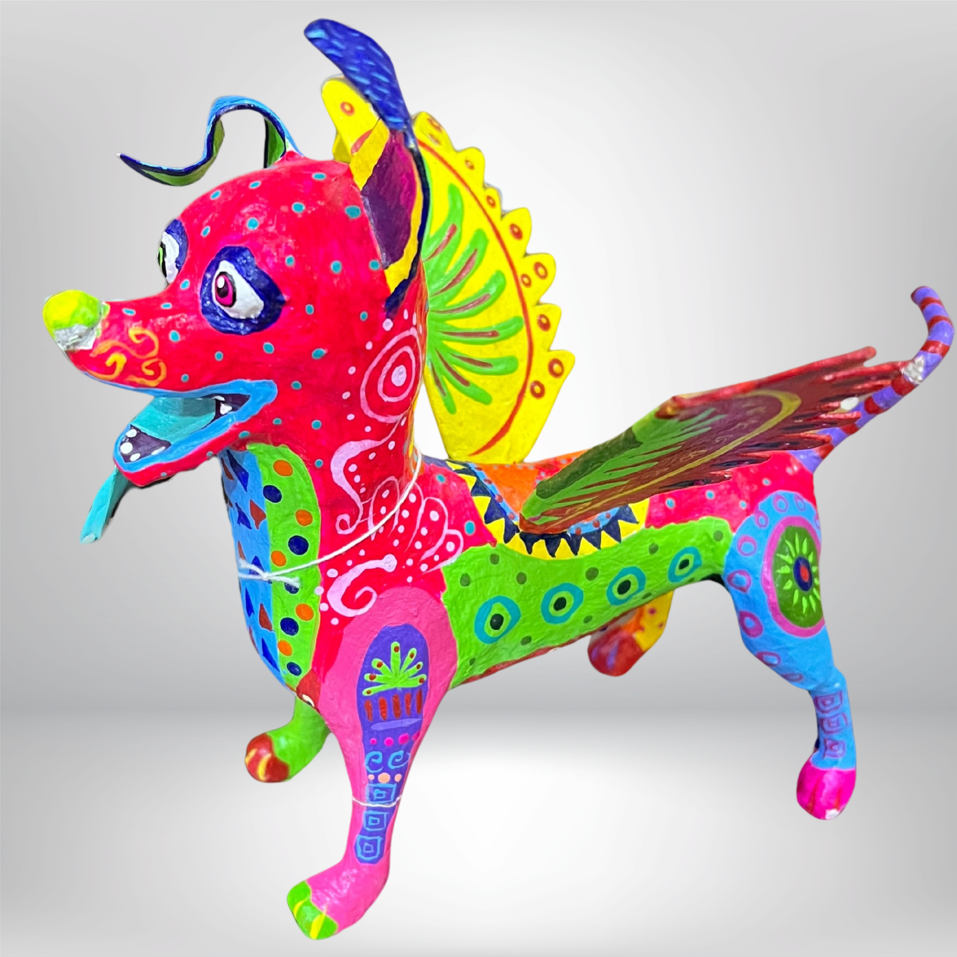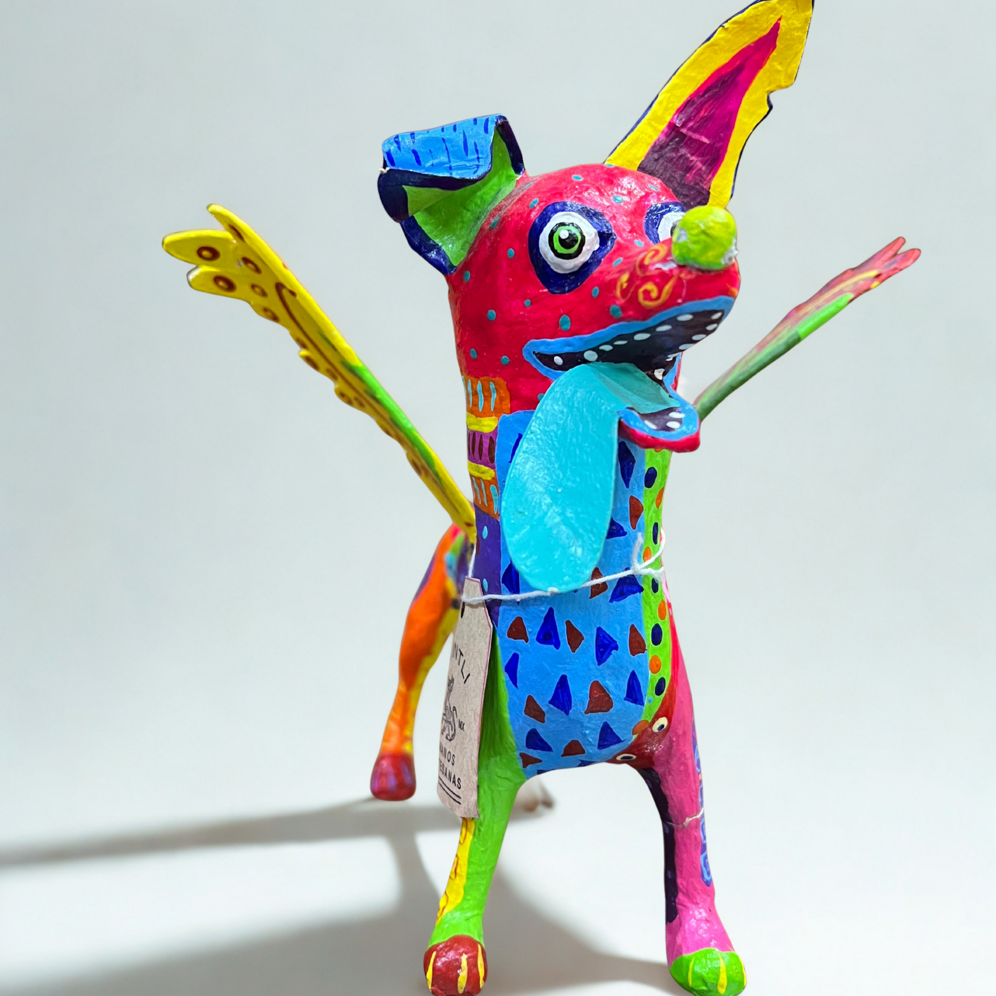 Celebra la tradición y el arte mexicano con esta hermosa figura de Dante hecha de papel maché. Cada pieza está elaborada a mano con papel maché, cuidando cada detalle para capturar la esencia del icónico perrito de la festividad de Día de Muertos. Perfecta como decoración, regalo o para añadir un toque auténtico a tu altar. Hecha con materiales ecológicos y pintada a mano, cada Dante es único e irrepetible.